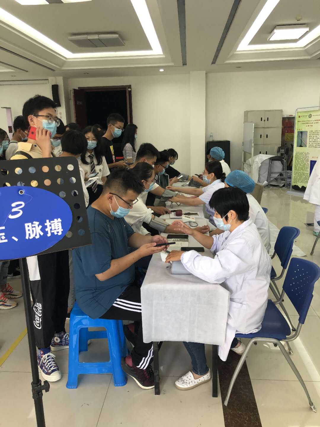 为确保本次入学体检工作安全、高效、有序完成,医院领导高度重视,从8月中旬提前准备,多次召集有关人员召开专题工作会议,研究部署体检工作,全院职工迅速行动,历时12天全员无休息,各项工作有序推进。在校信息管理处的支持下,开发了电子体检档案管理软件,实现了查体信息化。根据疫情防控要求,为防止学生聚集,将查体分散到三个区域进行。协调学校相关部门,把一般检查项目布置在礼堂报告厅,胸部X光片、内科和外科检查设在医院内,采血点布置在大操场。为防止新生抽血出现晕血、低血糖等意外情况,医院在采血处设立了急救点,准备了葡萄糖等急救药品,对有晕血迹象的学生,安排专人进行处理,确保学生顺利完成采血检查。